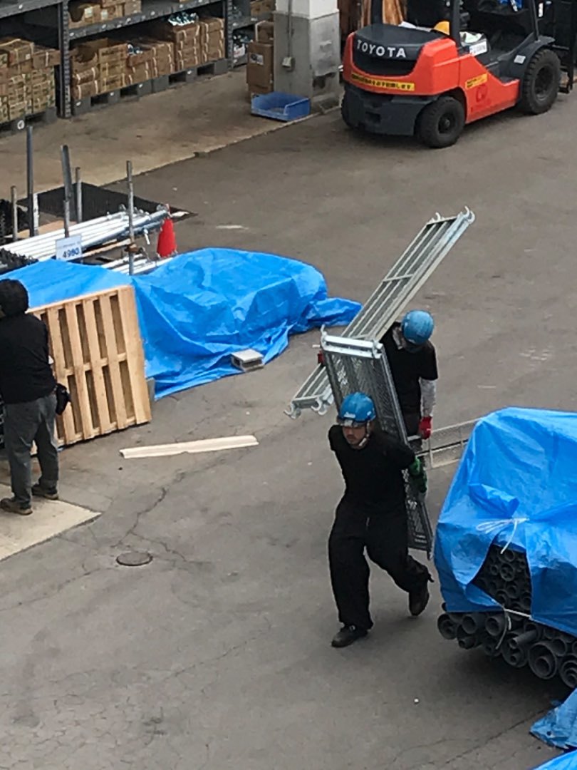 トラックから施工場所までの距離が長く人力で運んでました。みんな凄いなぁ。